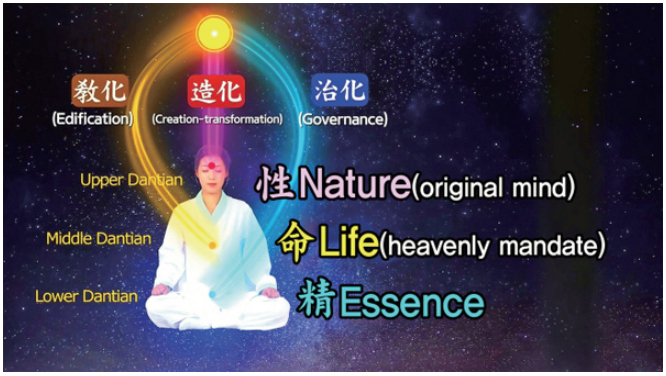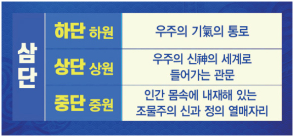 우리 몸에는 ‘빛의 통로’가 있습니다. 우주의 빛이 드나드는 세 통로가 있습니다. 얼굴 속에 하나가 있는데 그것을 상단上丹이라 합니다. 상원上元이라고도 합니다. 그다음 가슴 사이에 있고, 배꼽 아래에도 있어요. 그래서 상단과 중단과 하단이 있는 것입니다.