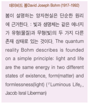이 대우주 만유의 본성은 빛입니다. 데이비드 봄David Bohm은 ‘만물은 빛이 굳어진 것(All matter is frozen light.)’이라 했습니다. 지금 우리가 앉아 있는 의자라든지, 나무라든지, 시멘트, 모래알이든지 다 빛이라는 것입니다. 그리고 우리가 이런 문명을 연 것은 우주 속에 있는 요소의 4%를 안 데에 근거한 것이라 했습니다. 과학자들은 우주에 암흑 물질(Dark matter)이 있고 암흑 에너지(Dark energy)가 있다고 합니다. 이것은 어둡다는 것이 아니라, 우리가 모르기 때문에 과학자들이 다크dark라는 말을 붙인 것입니다. 그래서 다크 메터, 다크 에너지가 95% 전후라는 거예요. 이건 전혀 알 수가 없다는 뜻입니다. 그러나 데이비드 봄은 이것도 빛이라고 본 것입니다. 그래서 우주 안에 있는 모든 것은 빛이 유형과 무형으로 나타난 것이라고 정의했어요.