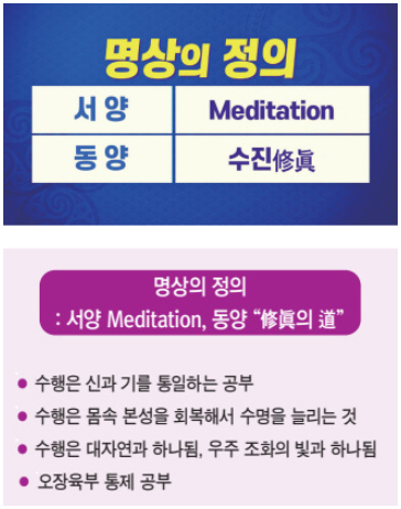 이 명상에 대해 동양에서는 대표적으로 선가禪家에서 ‘수진修眞의 도’라 했습니다. ‘참을 닦는 도’, 이것이 가장 대응이 잘 되는 말이에요. 그 외에 ‘수행’, ‘수도’ 또는 여러 가지 언어를 쓰는데 가장 멋진 언어는 수진입니다. 여기에 대한 만고의 명언이 있습니다. 선인仙人 광성자光成子가 전해 주신 말씀인데 ‘참이 아니면 선仙이 아니라는 것’입니다. 그래서 내 몸을 건강하고 빛의 몸으로 만드는 것은 단 한 글자, 참 진眞 자입니다.
