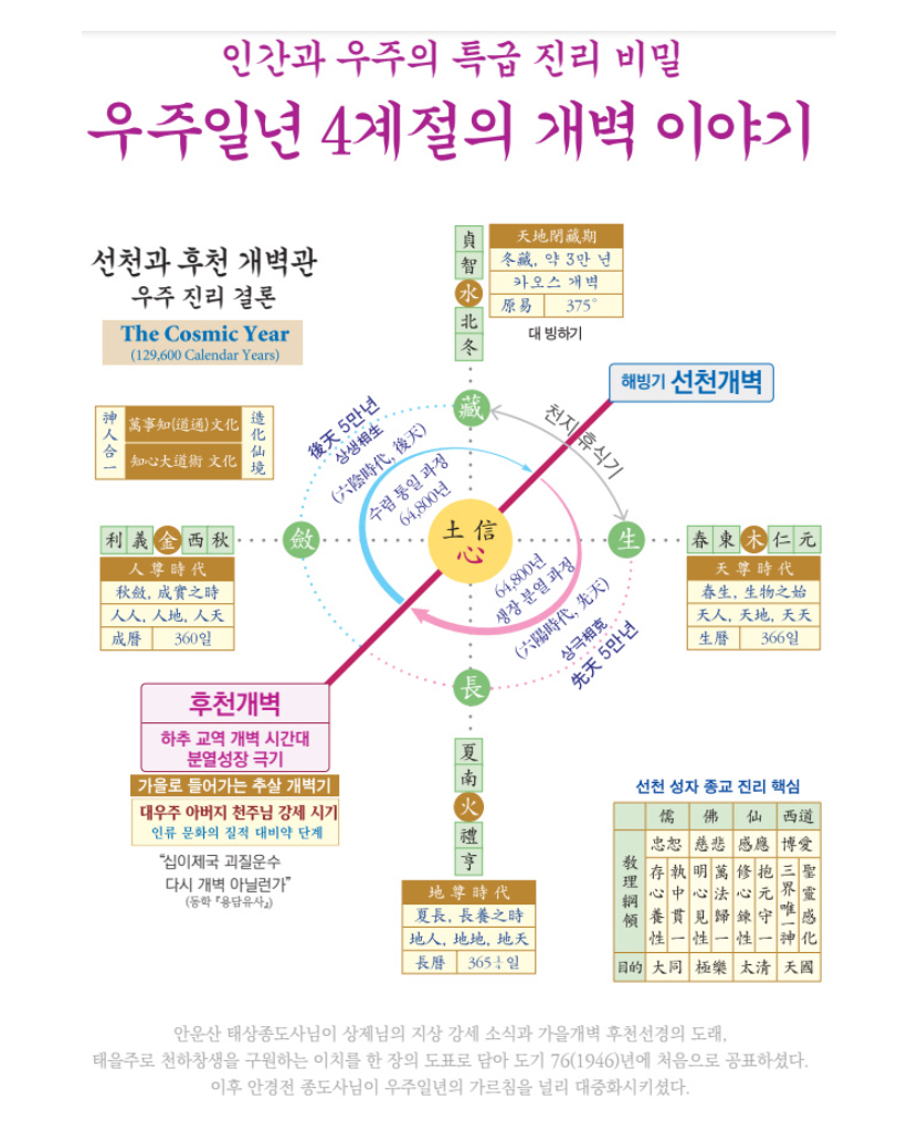 동양에서는 「천부경天符經」, 하도낙서河圖洛書를 거치고 소강절邵康節(1011~1077)을 거치며 1만 년 정도 걸려서, 동학에서 비슷한 메시지가 나왔습니다. 그리고 증산도에서 우주 일년도가 완성된 것입니다.